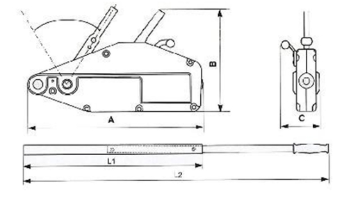 | 型號 | 額定載荷 | 額定載荷時手拉力 | 額定載荷時手柄往復一次鋼絲繩行程 | 鋼絲繩直徑 | 葫蘆重量 | 外形尺寸 |