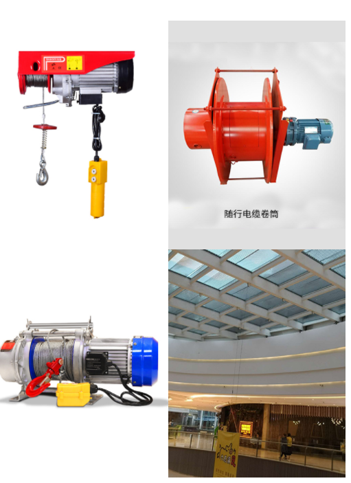 商場用電動提升機:現(xiàn)在每個商場基本都會使用商場廣告吊鉤,而這些廣告吊鉤大多是安裝在商場中庭邊緣的,通過導向輪把鋼絲繩引導過去然后垂下吊鉤,這樣在需要更換條幅的時候就只要輕輕一按,就可以放下吊鉤更換條幅了。