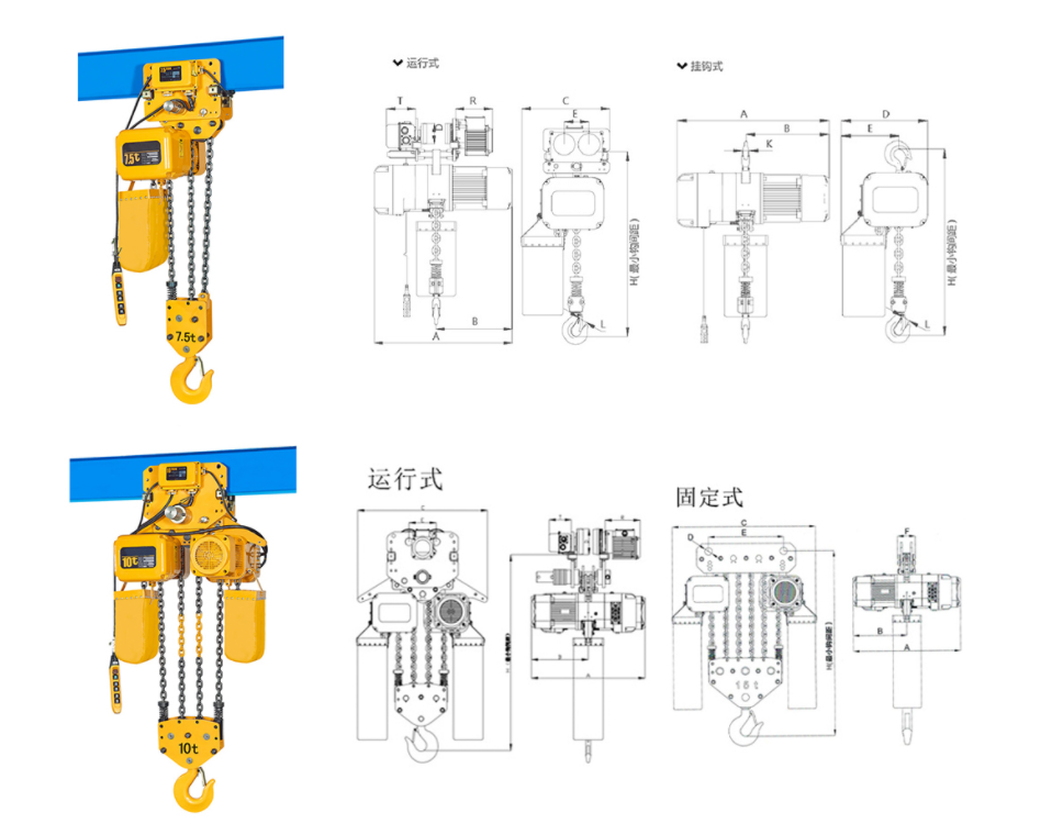 | 運行式環(huán)鏈電動葫蘆(7.5T-50T)尺寸參數(shù): | ||||||||